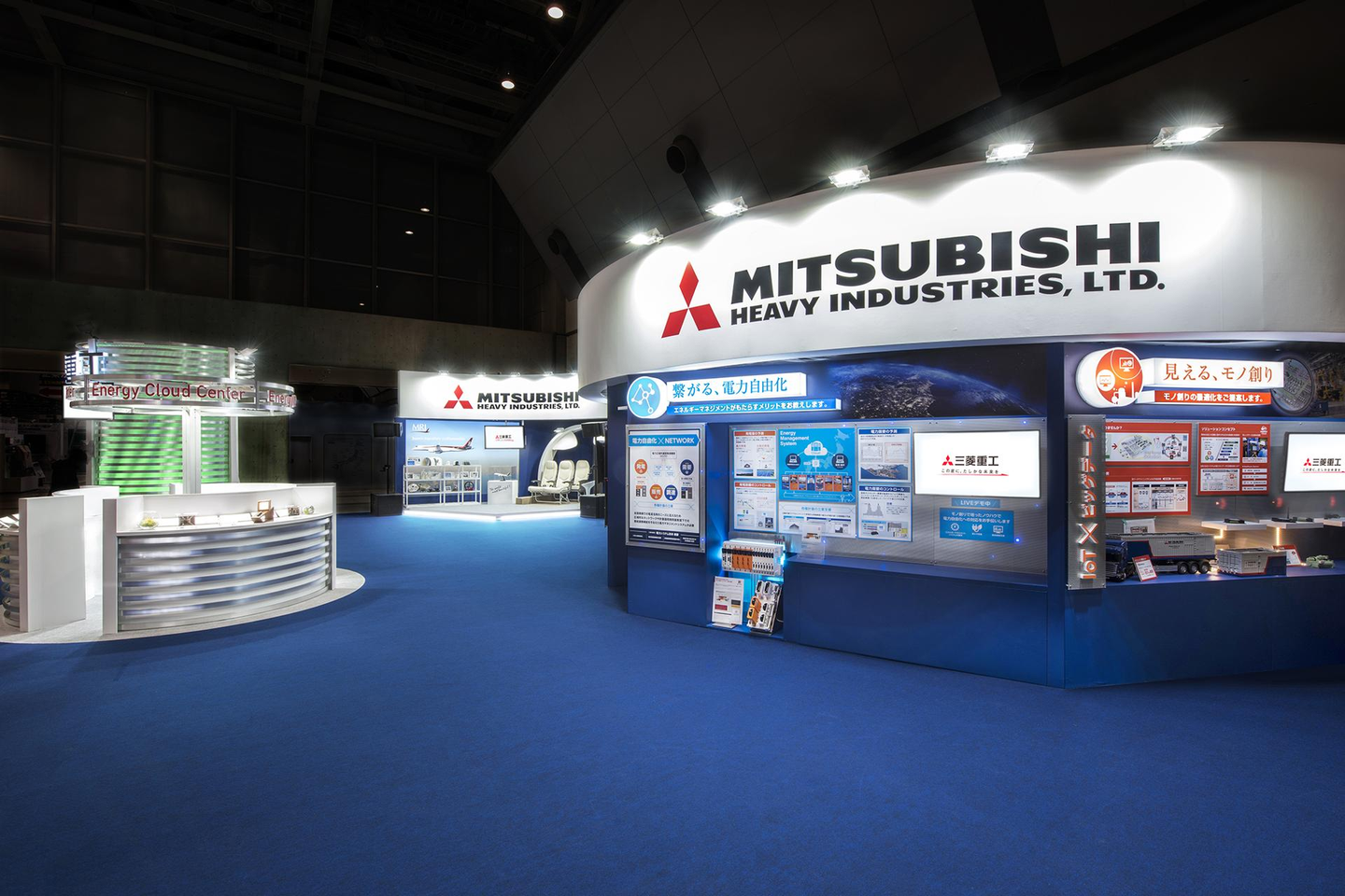 海から空、宇宙へのつながりをイメージし、ブースの床から壁面をブルーで統一。さらに監視塔を立てENERGY CLOUDが世界を監視しているように見立てました。