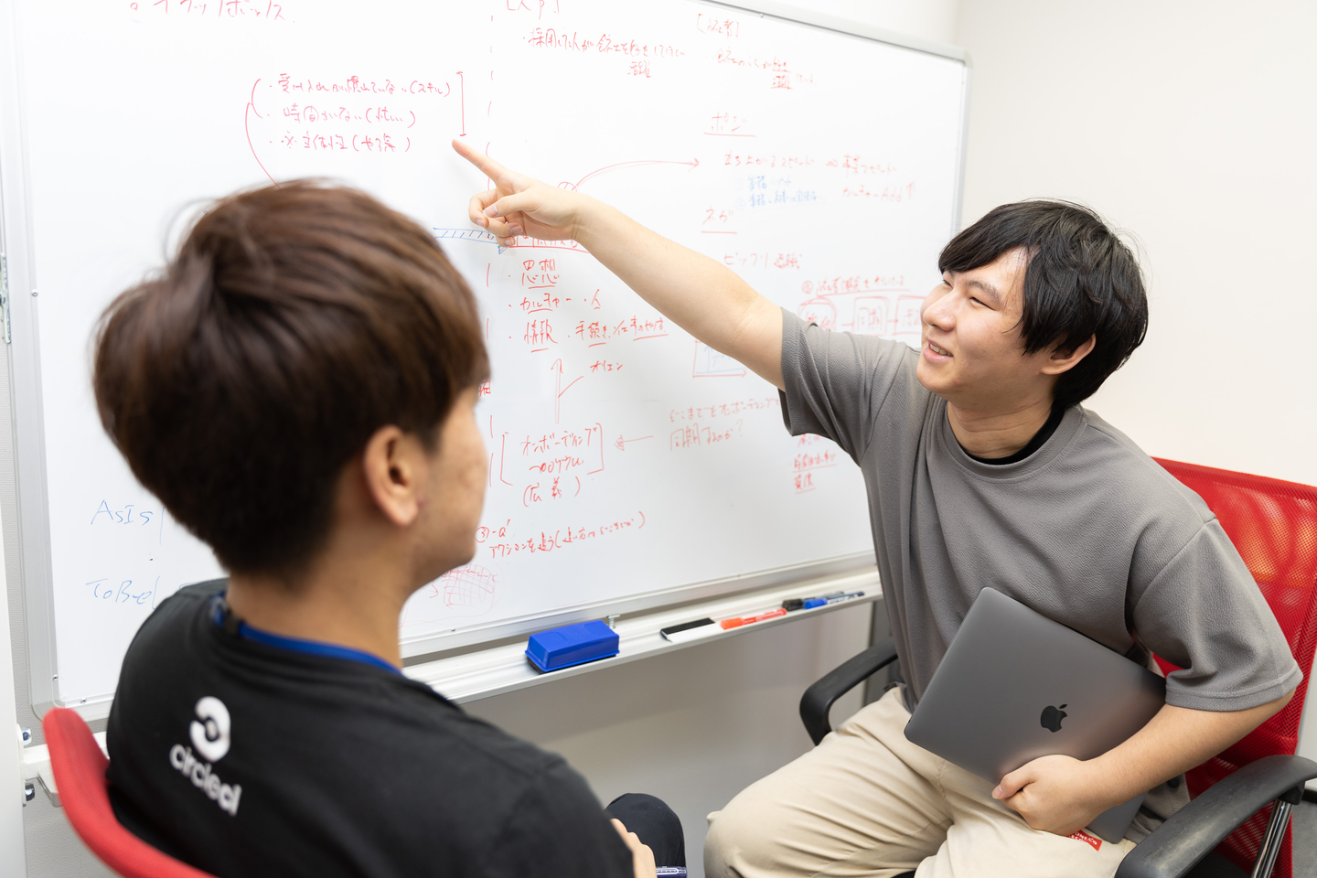 頻繁にディスカッションができることも魅力です。オフィスに出社すると秋山がよくミーティングをしているのですが、それが終わると「○○社さんはこんな課題を感じています。」とか「こんな機能があったらいいですね!」と話しかけてくれます。