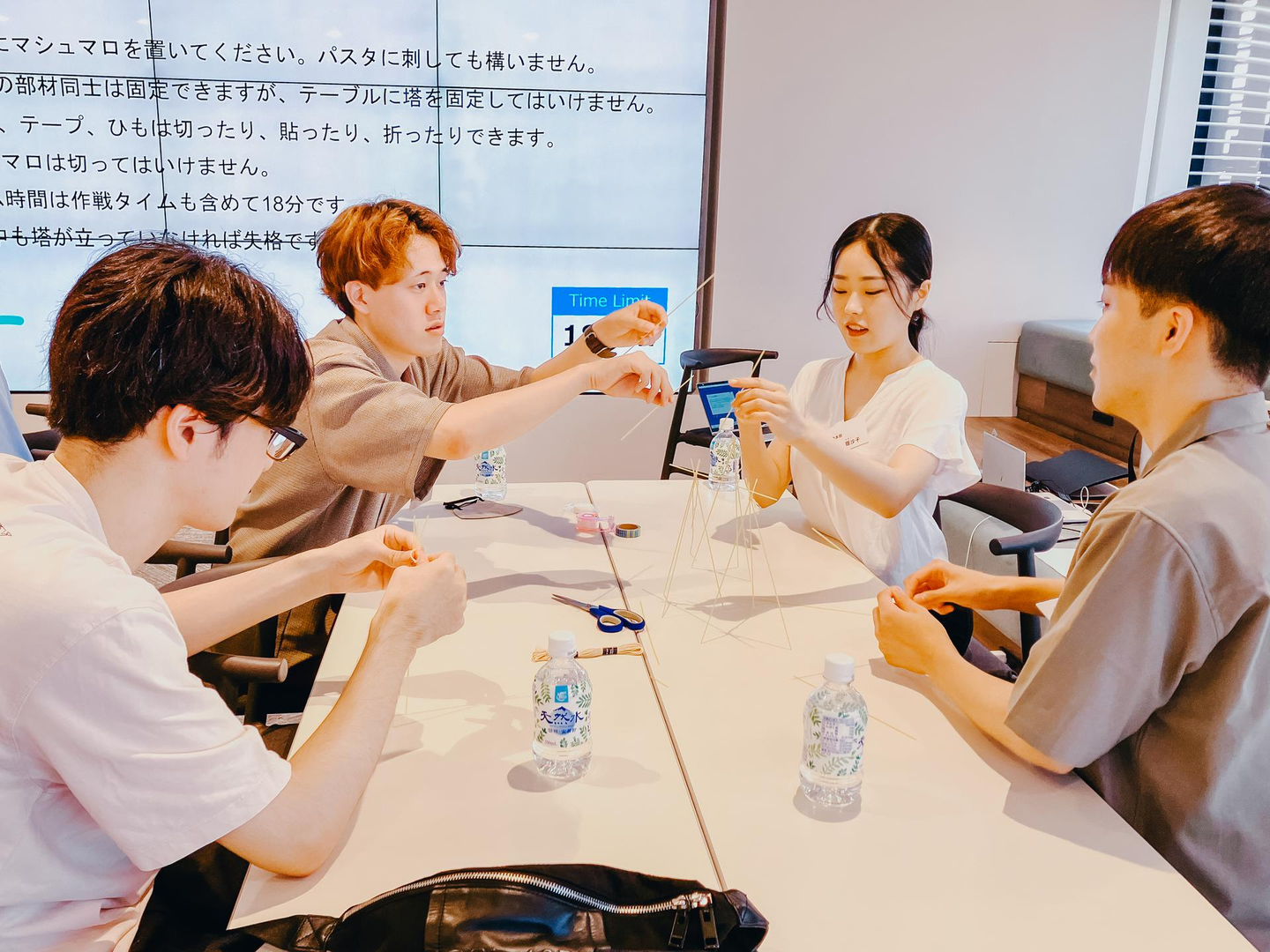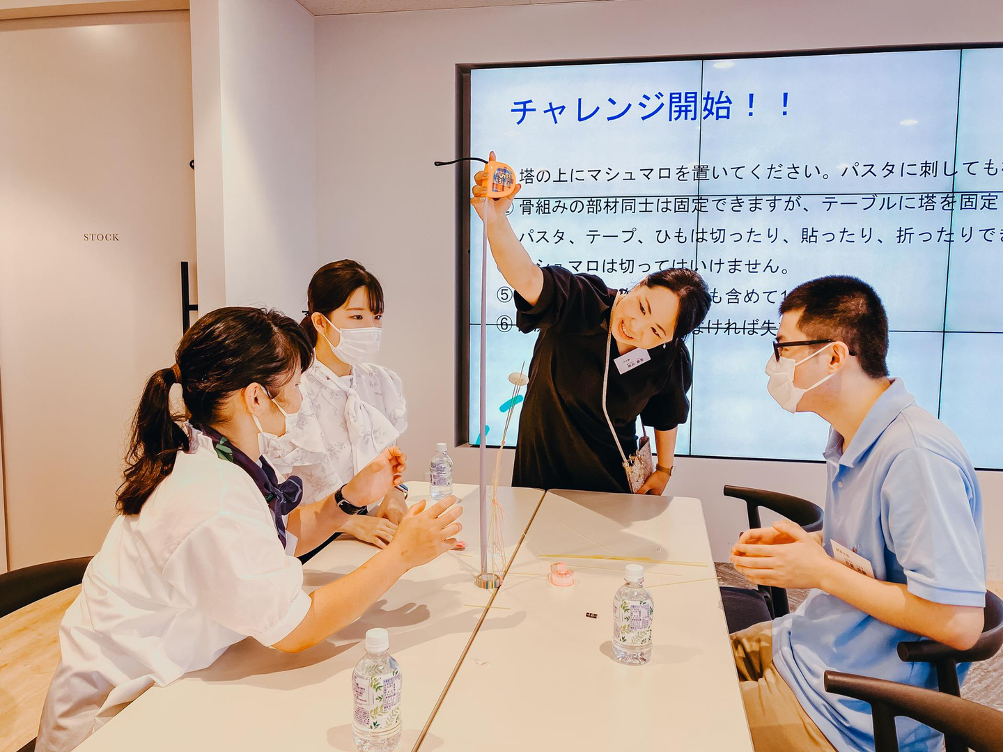 最後のワークは『マシュマロチャレンジ』。パスタ・紐・テープ・マシュマロ・はさみを使用し、制限時間内で自立可能なタワーを立て、いかに高い塔を完成させるかを競うチームビルディングです!作戦会議も含めて、所要時間は約20分間。長いように見えて、意外と時間が足りなく苦戦されていました。『パスタをどう繋げれば高くなるのか』『どういう形にすればマシュマロの重さに耐えられるのか』など、チームで話し合いながら協力してタワーを作っていきます。1番上にマシュマロを乗せるとバランスが崩れてしまったり、パスタが折れてしまったり…。なかなか一筋縄ではいかないのがこのゲームの醍醐味です。ですが、2つのワークをこなした皆さんのチームワークは抜群!協力してタワーを完成させていました!