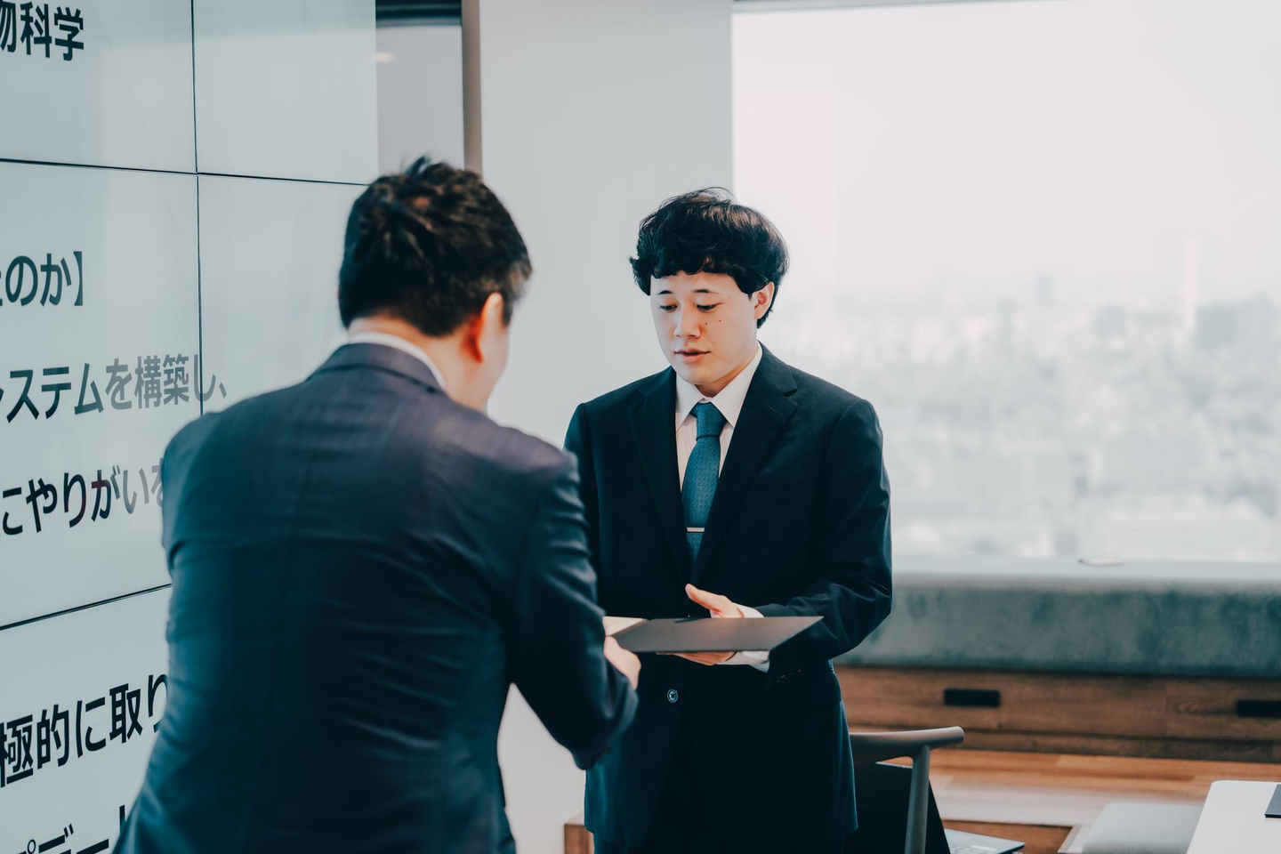 今年度の入社式は、ミガロホールディングス株式会社のカンファレンスルームをお借りして開催。41階のオフィスから見える絶景を背に、社会人としてのスタートを切りました。選考から考えると約1年近く関わらせていただいた11名の新卒社員の皆さん。新卒採用担当としてもこの『入社式』を迎えられた喜びは特別大きく感じております!内定者懇親会や内定者研修を通して内定者同士も顔見知りの状況でしたが、入社式当日は社会人1日目としてちょっぴり緊張感も交えながらのスタートでした。