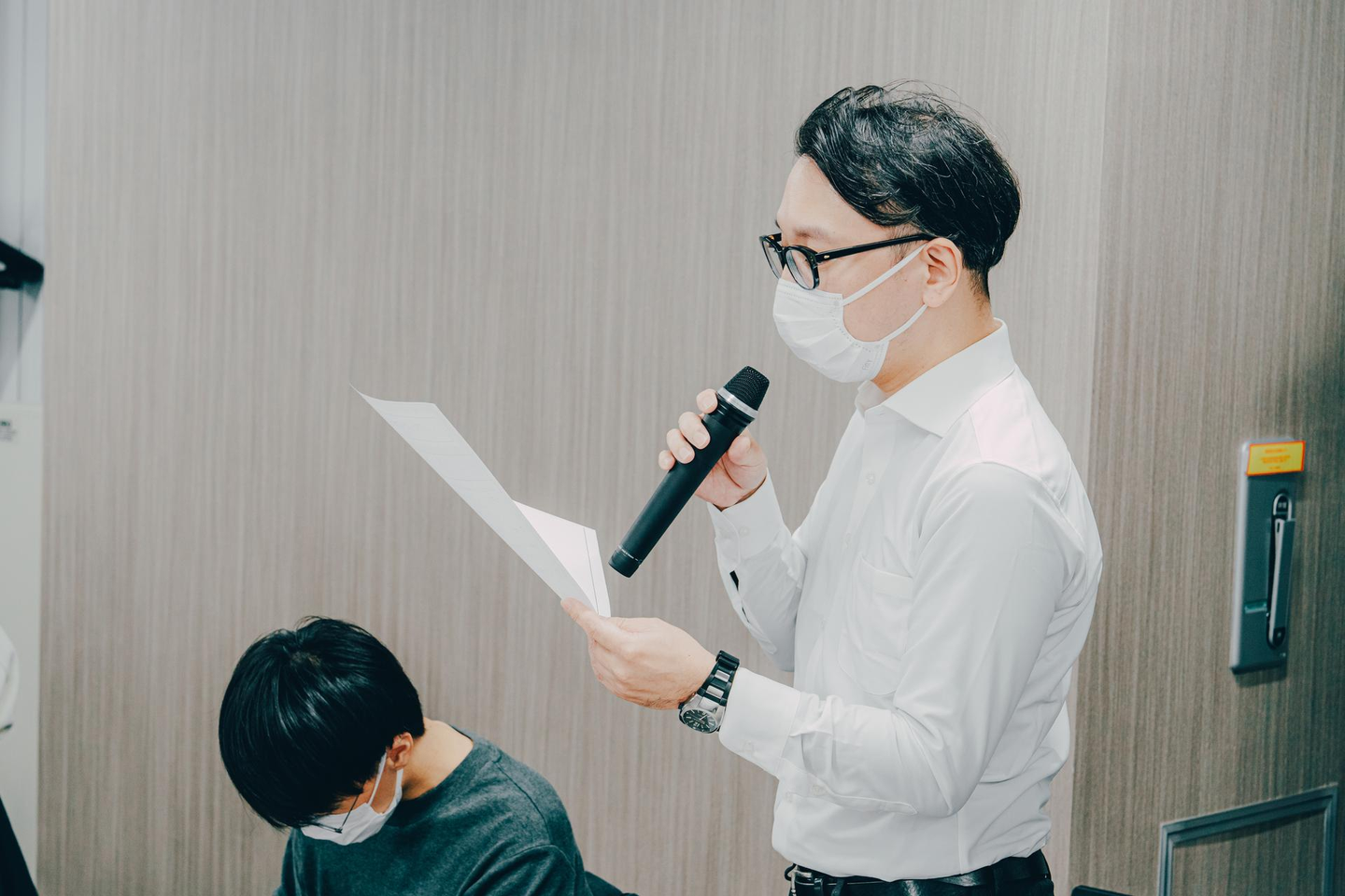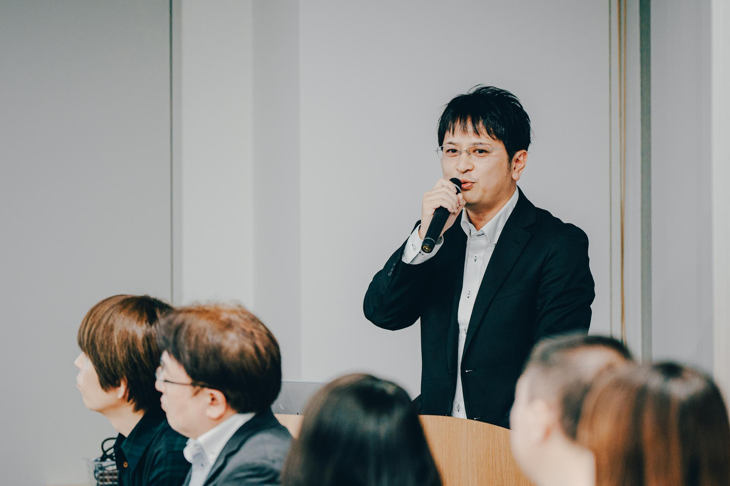続いては、大変久し振りのプロジェクト状況報告。T.Nさんと営業担当のH.Yさんに発表いただきました。30分という長丁場の中、聞き手を飽きさせない工夫がたくさん施されており、参加者全員がT.Nさんの発表に聞き入っている様子が印象的でした。エンジニアとして20年以上の経歴を持つT.Nさんだからこその目線で『新人教育』や『技術者育成』といったトピックスに触れていただいたのも印象的でした!
