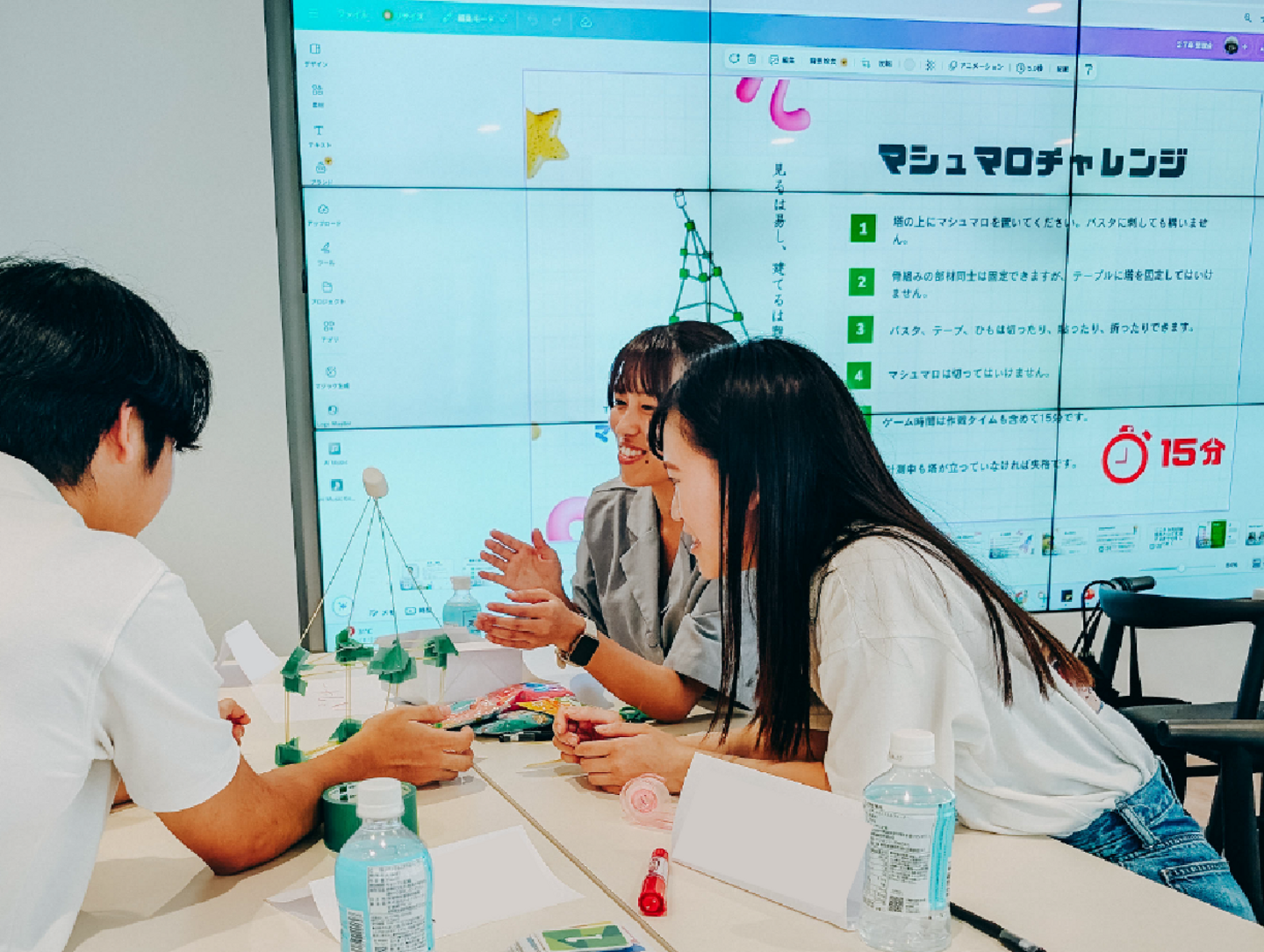 パスタとマシュマロを使い、どのチームが一番高く積み上げられるかを競います。