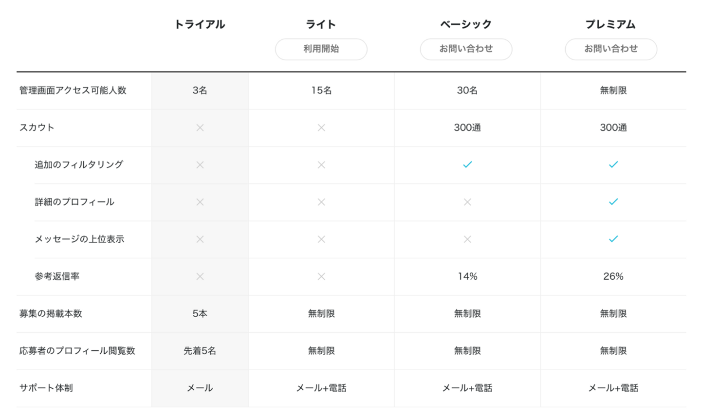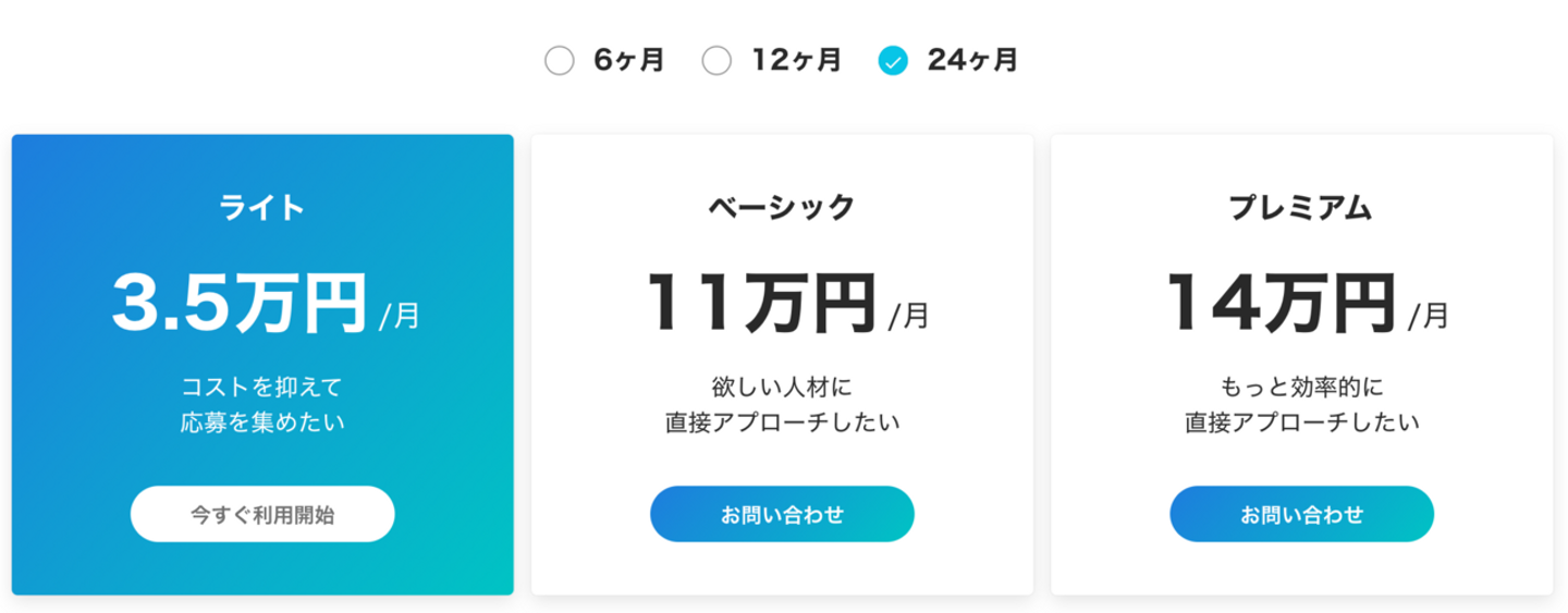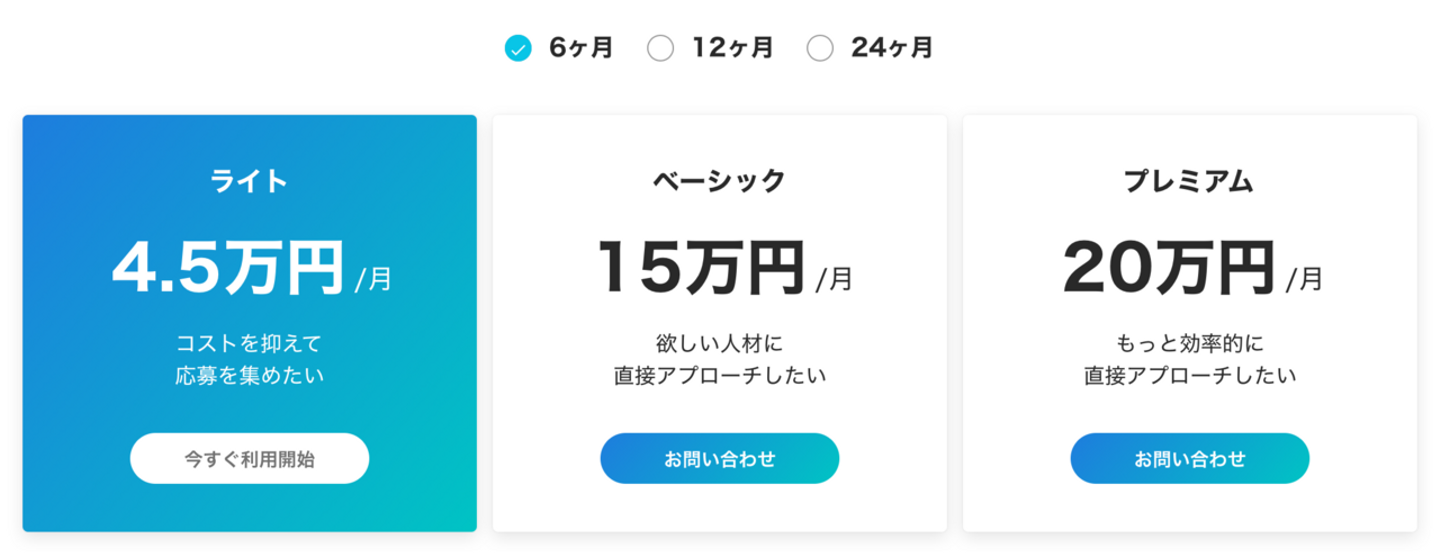 スカウト機能なしで、募集無制限が月額5万円以下というのはめちゃくちゃ安いですね。