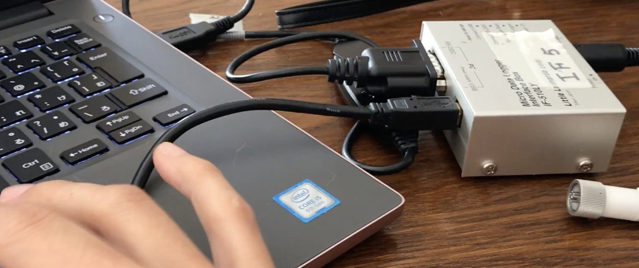 ①専用のインターフェイスを使って、データロガーとPCを接続し、加速度サンプリングレート(今回は20Hz)など設定値をロガーにセットする