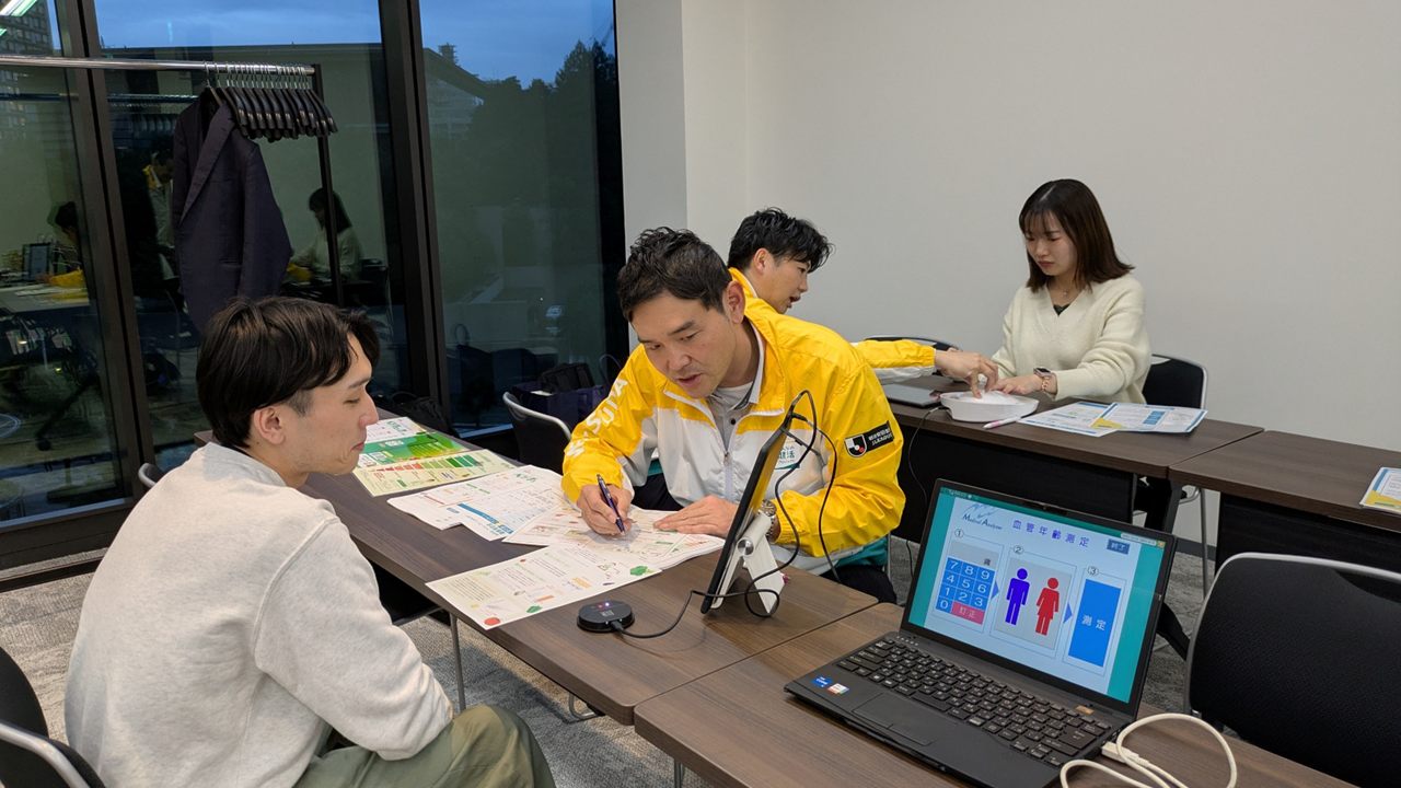 希望者のみ参加でヘルスチェックを行いました。社員の健康を第一に考える弊社では、社員総会の際に毎回行っています。簡単なゲームで脳年齢を測定したり、特殊な機械を使用して野菜をとれているかチェックしたりとユニークな診断で盛り上がりました!