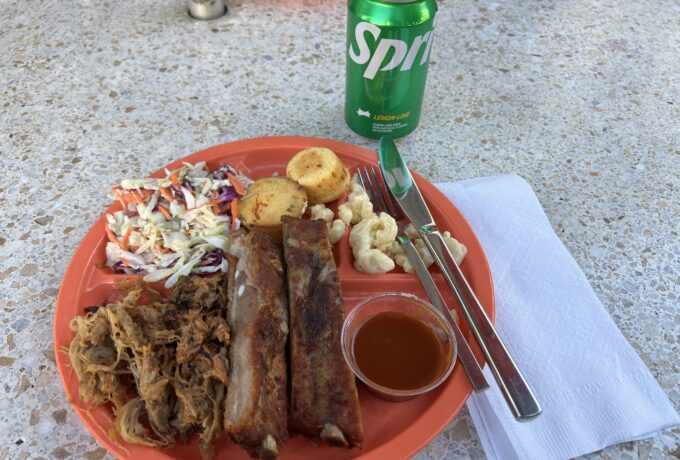 今回はBBQのランチとスプライトをいただきました。アメリカのようなジャンキなー骨付き肉でおいしかったです。