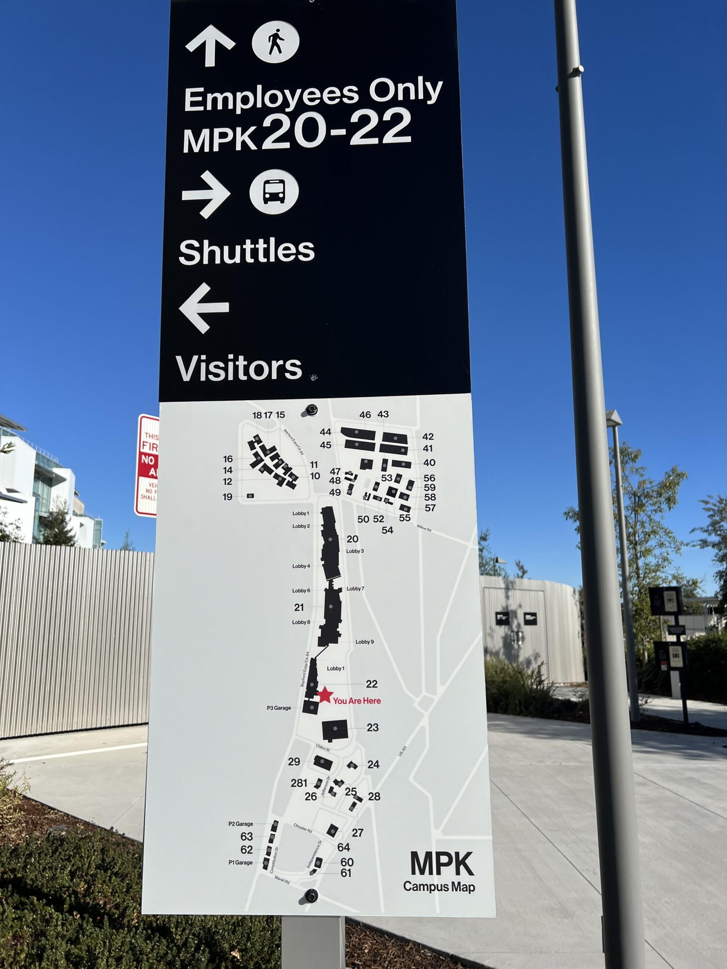 Metaオフィスの全体像は以下のようになっており、約60棟もの建物からなっています。この地図だけではスケールが感じづらいかもしれませんが、イメージとしては大学のキャンパスが何個か集まった感じがしました。