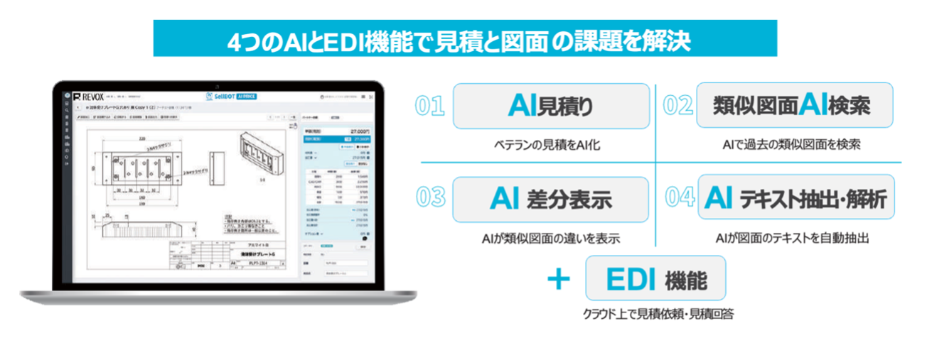 すぐに、だれでも、カンタンに、製造業のDXを推進するクラウドサービス。「AI見積り」「類似図面AI検索」「AIテキスト抽出・解析」「AI差分表示」の4つのAIを通じ見積・受注・調達・設計業務における様々な課題を解決します。使えば使うほどAIが賢くなり、経験と勘に頼りがちな業務フローを変革します。