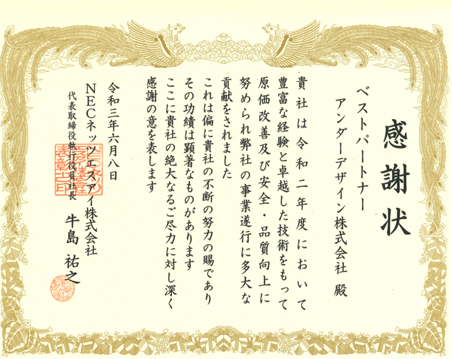アンダーデザインは令和3年6月8日NECネッツエスアイ様のベストパートナーとして表彰を受けました。