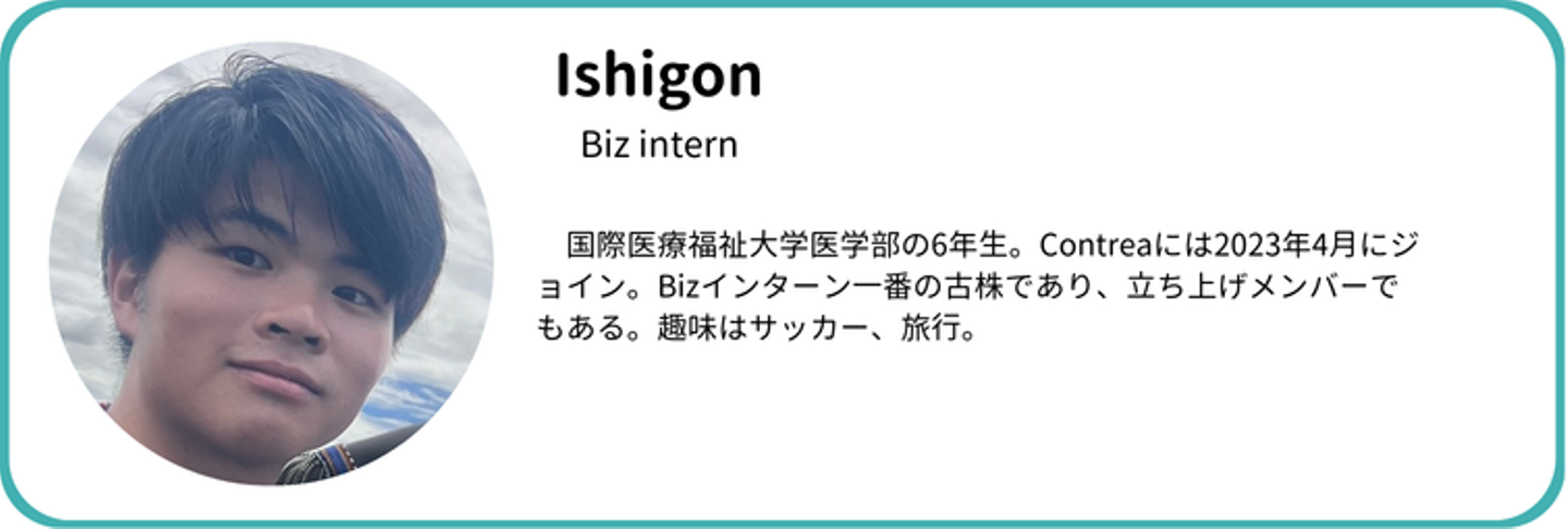 Contreaは医療の世界であると同時にスタートアップの世界でもあって、一般的な「インターン」という言葉から想起される会社とはちょっと違うと思うんですよね。スタートアップって普通の人ってあんまり触れないし、医療も機会がないと触れないと思うんですよね。それを経験してもらえるのは思い出にまずなるかなと思って、この時に得た感覚とか価値観とかがどこかでふとした瞬間に出るかなっていうのは思ってて、そうなるといいなと思ってます。