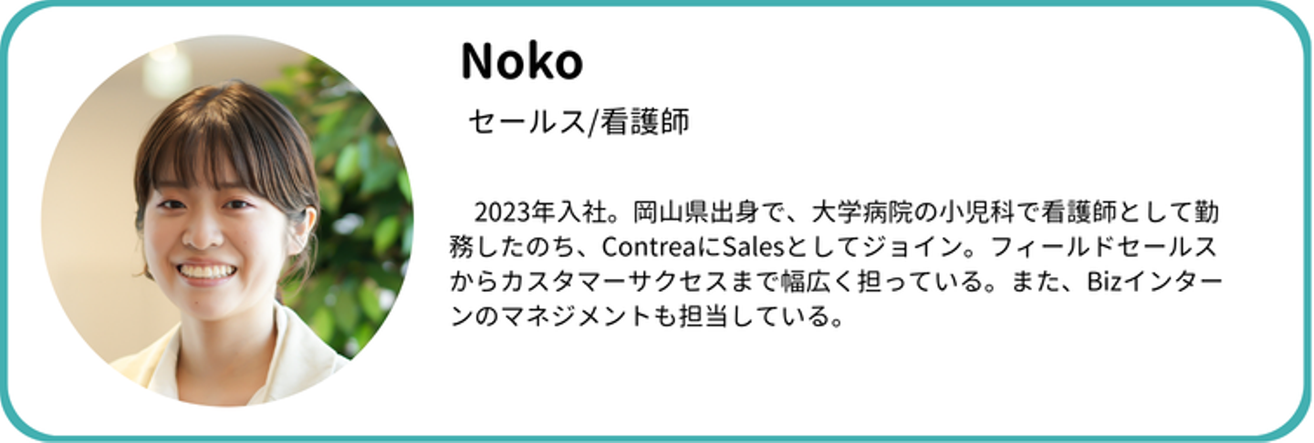 あとは、医療系ってこともあって、一般企業で働くのがContreaが初めての社員さんも結構いらっしゃるんですよね。そうした環境の中で、会社員の方がステップアップしていく様子が間近で見られるのが、医療系のインターンで働く良さみたいなところとしてあるのかなと思います。