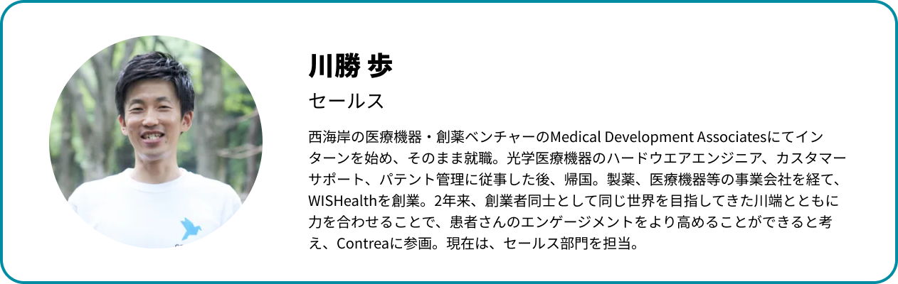 川勝さんはセールス部門を担当されており、営業としてMediOSのファンを増やし、MediOSの導入が現場の課題解決の入口となるように多数の医療現場で面談をされています。
