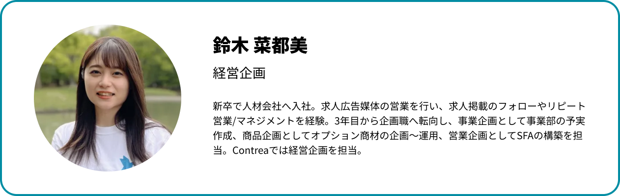わたしの中では「ContreaをContreaたらしめているもの」だと思っています。それは、そこにいる人たちが入れ替わっていっても、大事な根底にあるものは変わらず新たなよいものは取り入れ進化を遂げていく。そういった組織がやはり社会貢献という価値の提供+個人の成長にも繋げられる組織になれるのかなと。