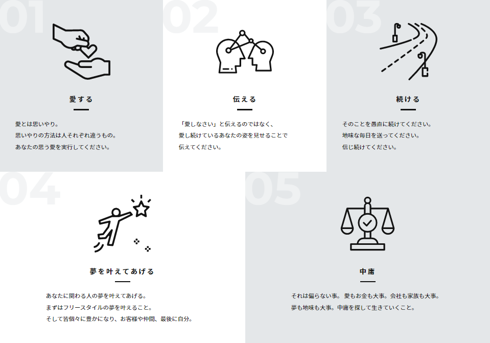 この5つの行動指針はフリースタイルが大切にしている「ペイ・フォワード」の考え方をもう少し細かい行動に落とし込んだものです。