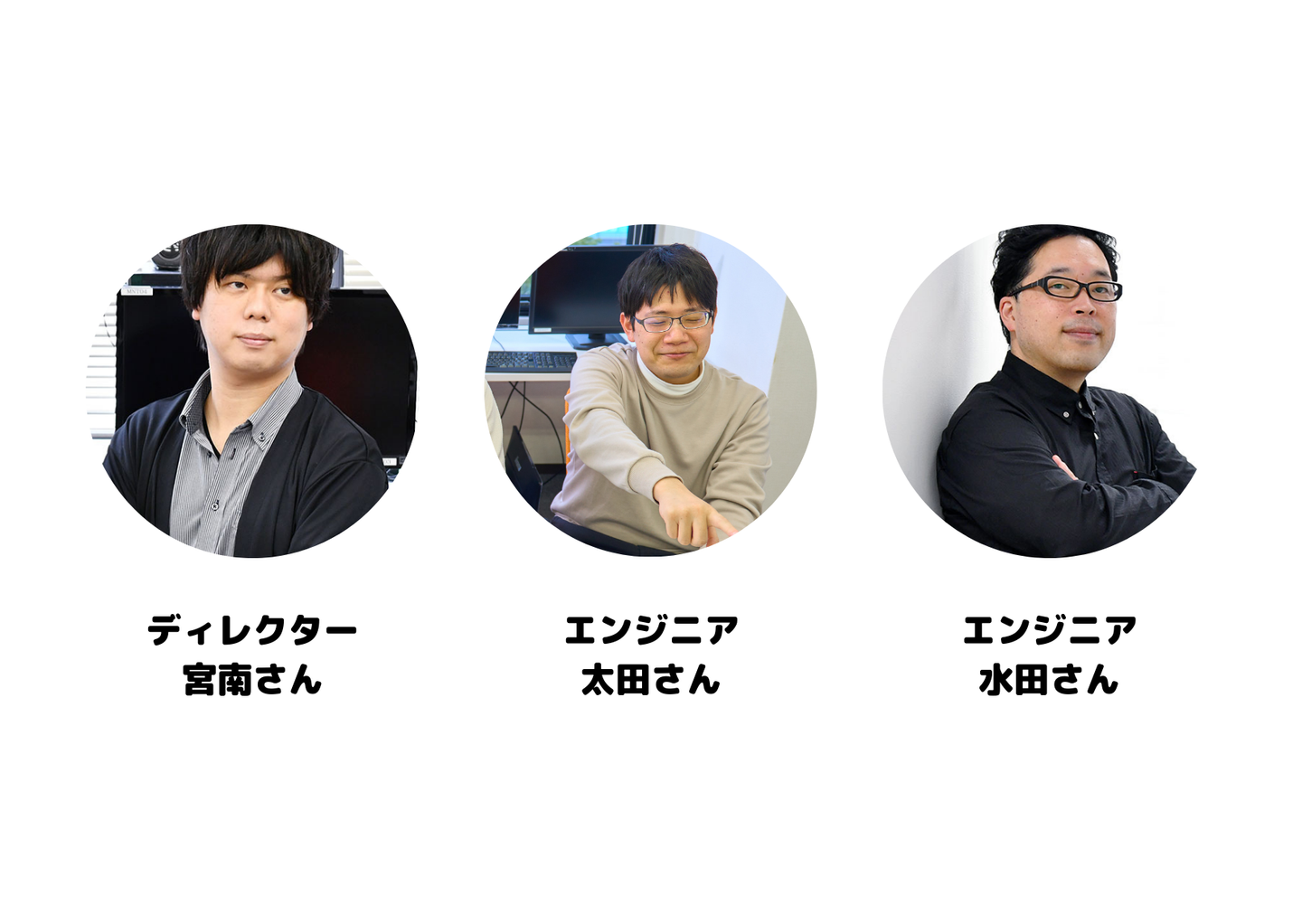 フリースタイルゲーム事業部からディレクターの宮南さん、エンジニアの太田さん、ITソリューション事業部からゲーム制作経験もあるシステムエンジニアの水田さんが参加しました。