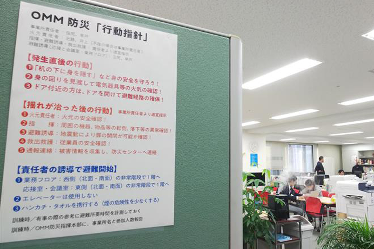 日頃からの心がけが大切との想いから、フロアの目につく場所に掲示してある防災「行動指針」