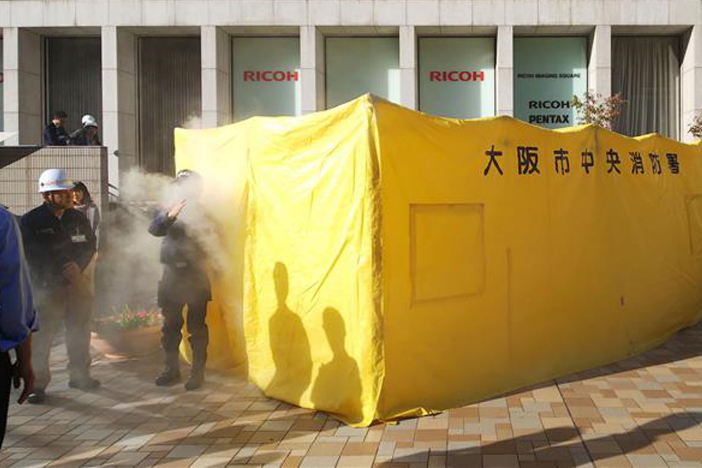 大阪本部のあるOMMビル館内の非常放送の開始とともに訓練開始!