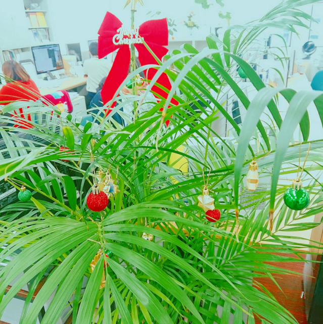 社内のクリスマスムードを高めるため、観葉植物のシゲル君にクリスマスの飾り付けをしました~!