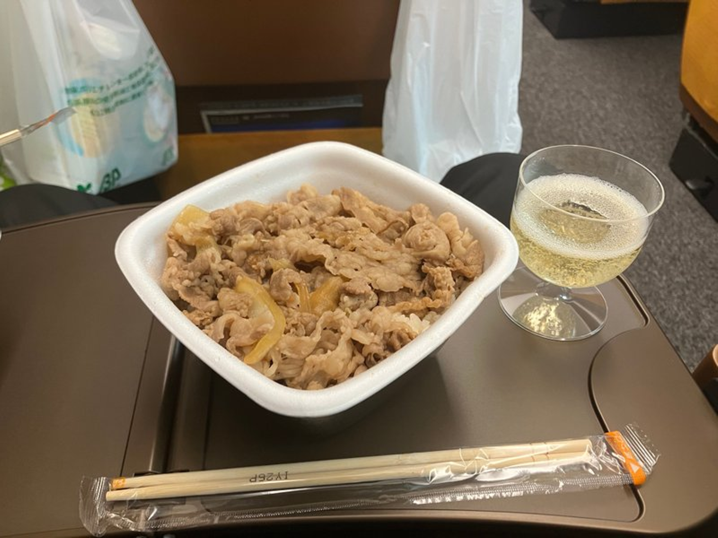 車中では、ずっと食べたかった吉野家の牛丼を頂きました。