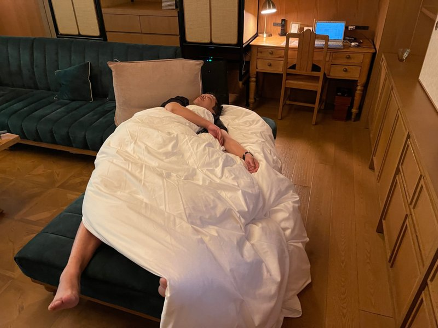 気付いたら、そのままソファーで寝落ちしていました。いつの間にか、社長に写真を撮られていた。