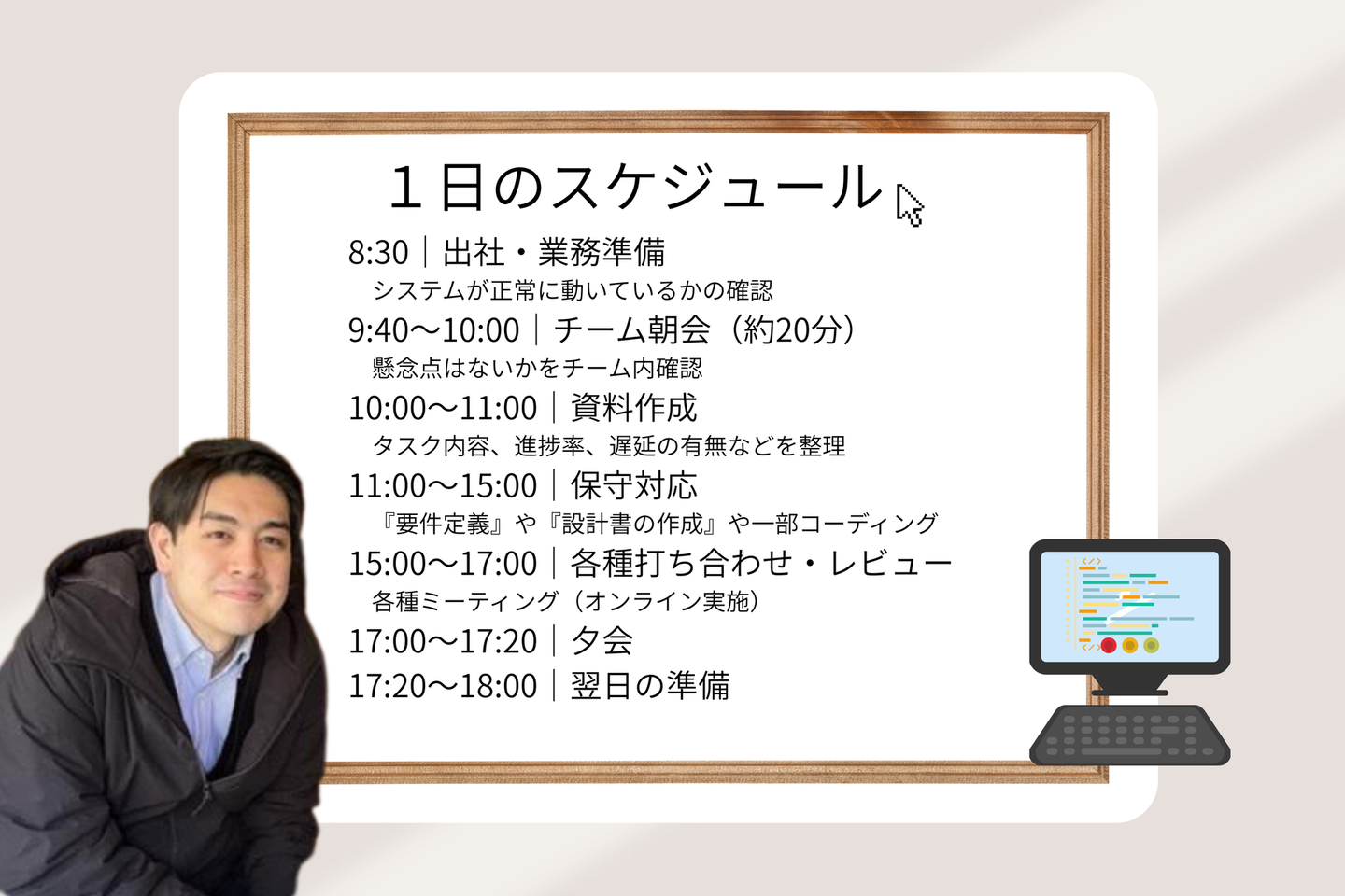 日々どのような業務に向き合い、どんな役割を担っているのか。実際の一日の流れを通して、エンジニアという仕事のリアルな姿をお届けします。