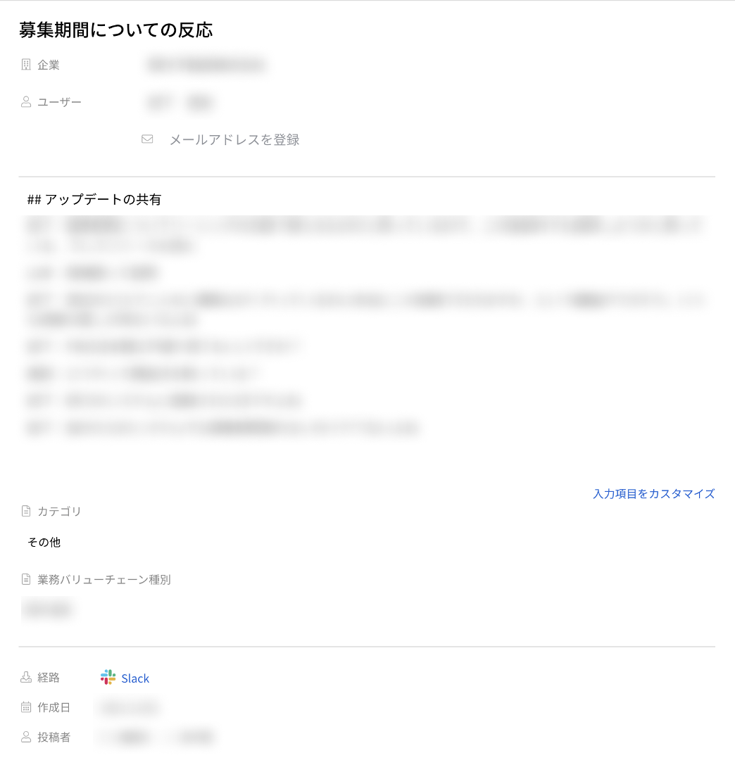 上記のとおり、顧客の生の声のみを蓄積していったものがVOCであり、定例会議の議事録からプロダクトに関する部分だけを抽出したり、お問い合わせの内容がそのまま一つのデータベースとして蓄積しているものと考えて頂けると近いかと思います。