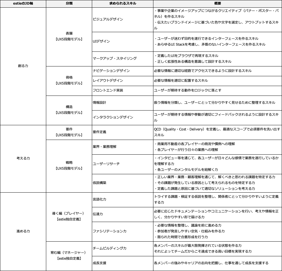 振る舞いに書かれているestieのJD軸を最も上位の概念に置き、その軸をUX5段階モデルの5要素とestieのデザイナーならではで求められる要素で分類し、さらにそれに紐づく具体的なスキルを定義することにしました。