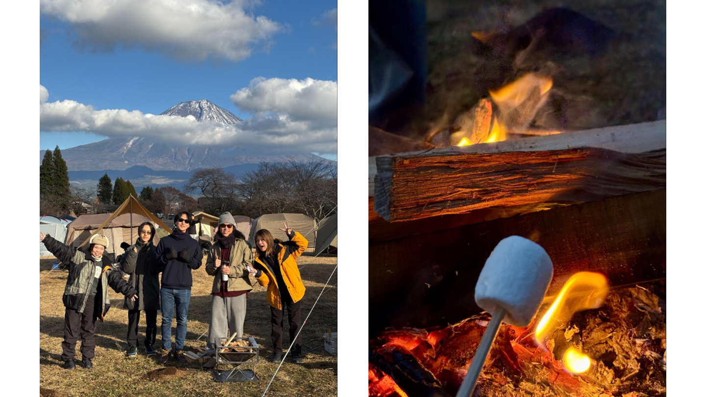 晴天で富士山がよく見える中、おでんや焼き鳥など美味しい食事とお酒を飲んでたくさんおしゃべりして楽しい時間を過ごしました。