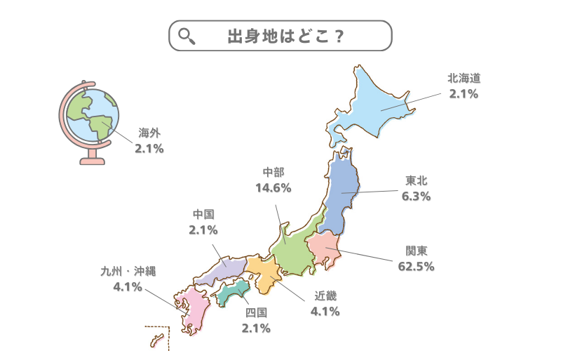 関東出身者が62.5%とダントツで多いですが、北から南まで全国各地の出身者がいることに加え、海外出身者もいることに驚きました!出身地がバラバラのメンバーが今同じ会社で働いているのってなんだか感慨深いですね。
