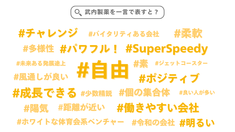 さいごに「武内製薬を表す言葉」を募ったところ、ポジティブなワードがたくさん集まりました!確かにどれも武内製薬らしいですね。対人関係では明るくて良い人が多いという意見が多数あり、環境面では程よい自由さと裁量権があるため自分で考え成長できるといった声が多かったです!
