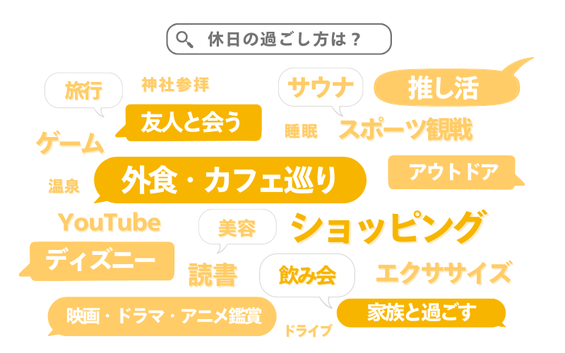 休日の過ごし方は「外食・カフェ巡り」「友人や家族と過ごす」「ショッピング」といった回答が多かったですが、こちらも三者三様さまざまな楽しみ方がありました!平日仕事を頑張ったあと、休日を思いっきり満喫できるよう、オンもオフも全力で楽しめる環境です。