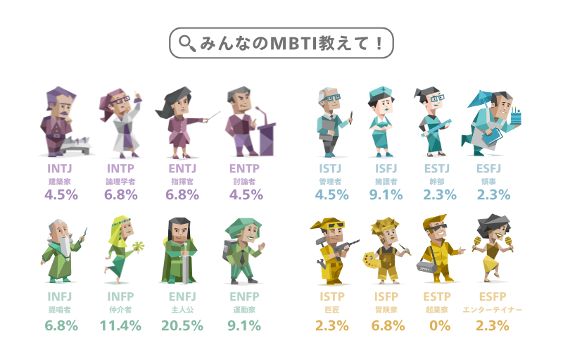 密かに気になっていたMBTIはこのような結果に!ENFJを筆頭に、NF型の外交官タイプが多いものの、満遍なく個性豊かなメンバーが揃っていることがわかりました。それぞれが持ち味を生かして仕事をしたり、お互いを尊重しあって活躍していける環境だと思っています◎