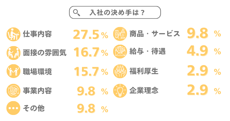 入社の決め手は「仕事内容」が一番多く、次いで「面接の雰囲気」「職場環境」という結果になりました!仕事内容は転職活動の軸として考えていた方も多いからこその結果ではないでしょうか。