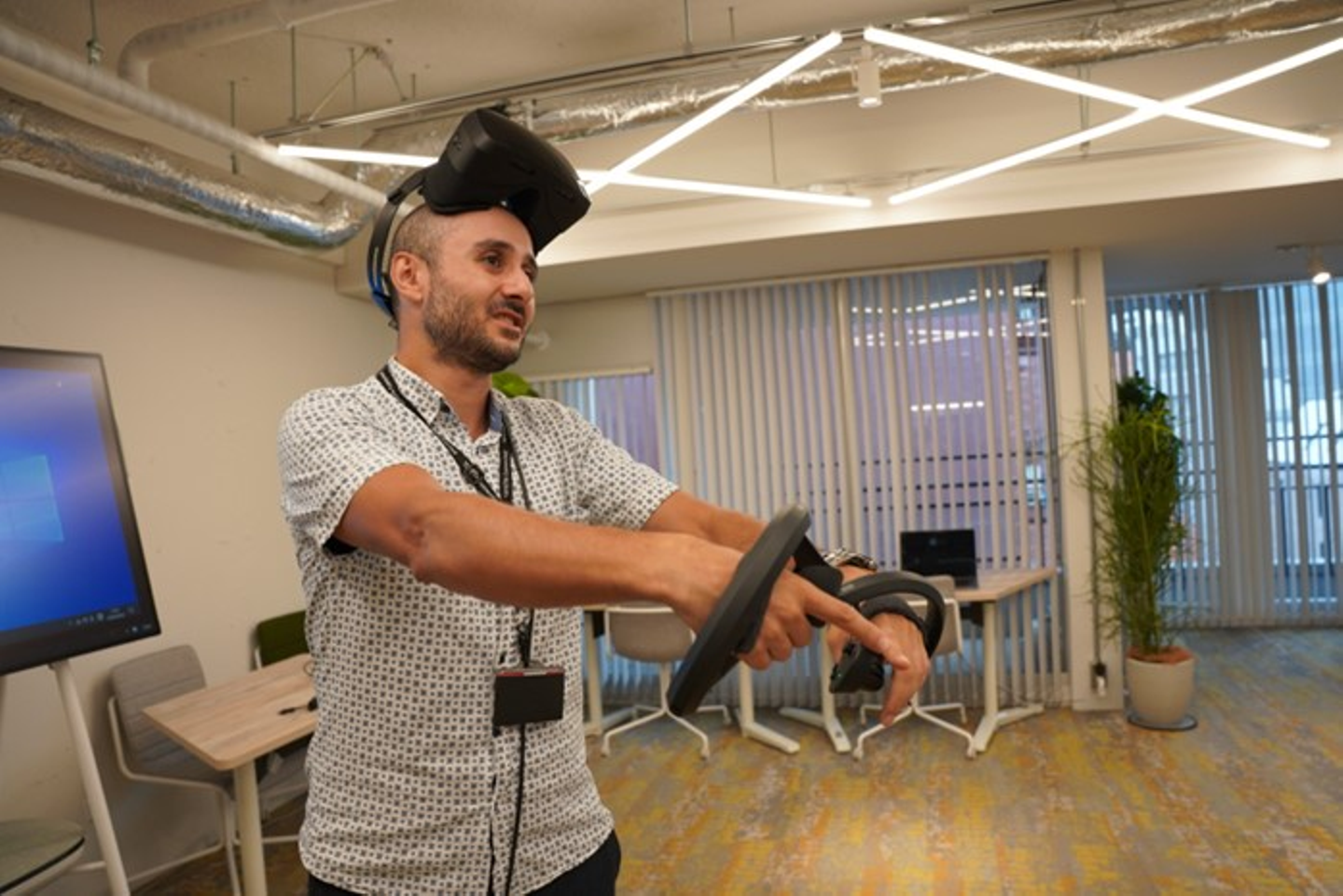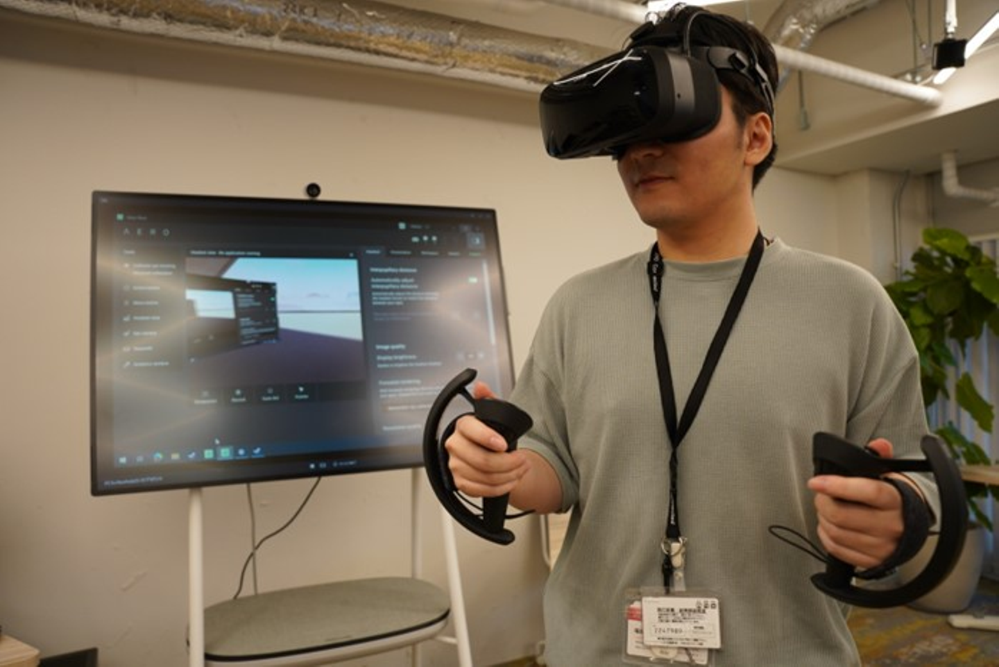 業務用VR機器を装着する富田さん