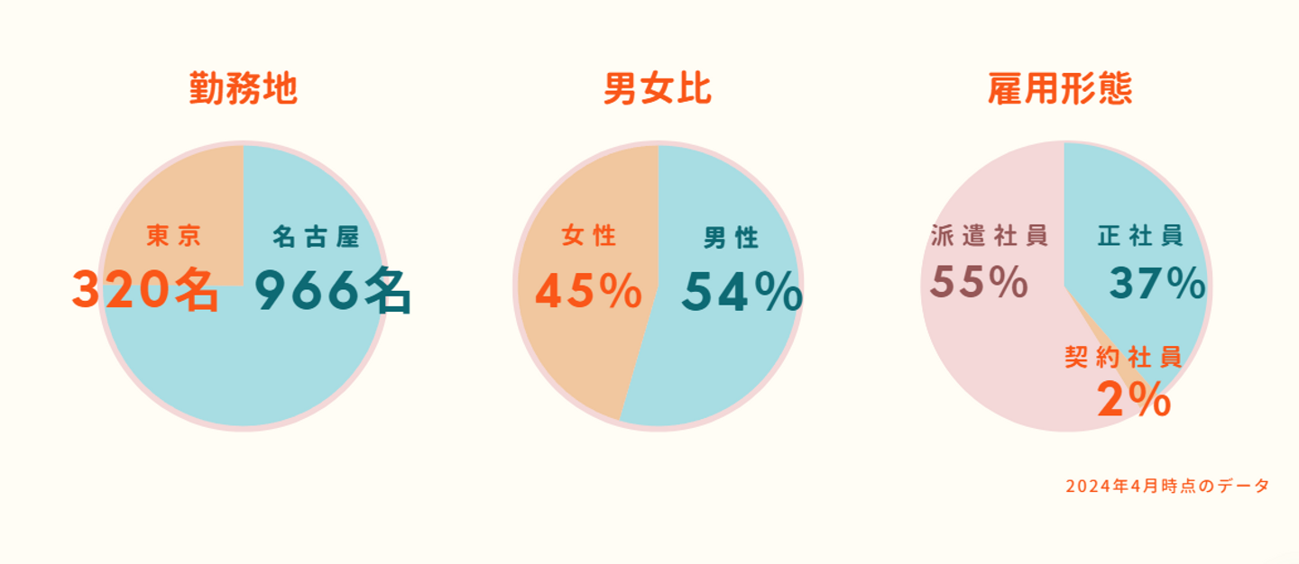 社員数と勤務地 2024年4月現在、社員数は1286名です。2021年の同データでは1015名だったので、286名も社員が増加しました!勤務地は名古屋本社が76%、TOKYO GLIP24%と、東京勤務の社員が大いに増えています。