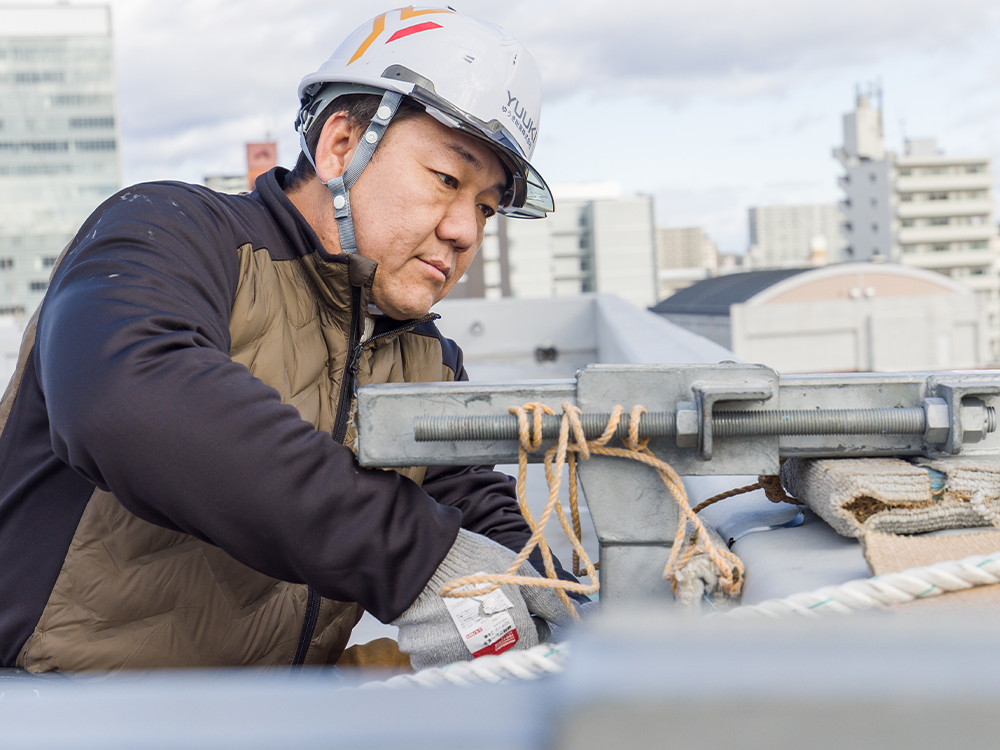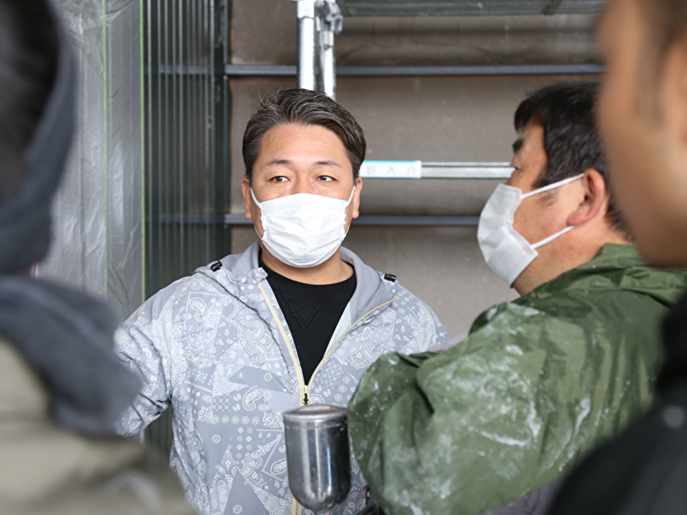 俺の幸せは仲間と同じ飯食って同じ格好で同じ仕事をすること。だから社長だけどトイレは毎日掃除するし、夜間作業でモルタルだって運ぶ。タイル屋も左官屋も工務店も同じ。一緒に仕事する人とは同じ釜のメシを食う仲間でいたい。創業当初、夜の事務所での技術談義は本当に楽しかったし、扉が外れるぐらいの中古車、1Kに8人で雑魚寝した県外の仕事は今では笑い話だ。今でも変わらずどんなに遅い現場でも誰かのピンチには一目散に駆けつける。緊急の夜間作業でもヘルプを伝えたら20人ぐらいがバーッと集まる。外壁塗装が一大イベントだったあの頃から泥臭い働き方が自分らしい。