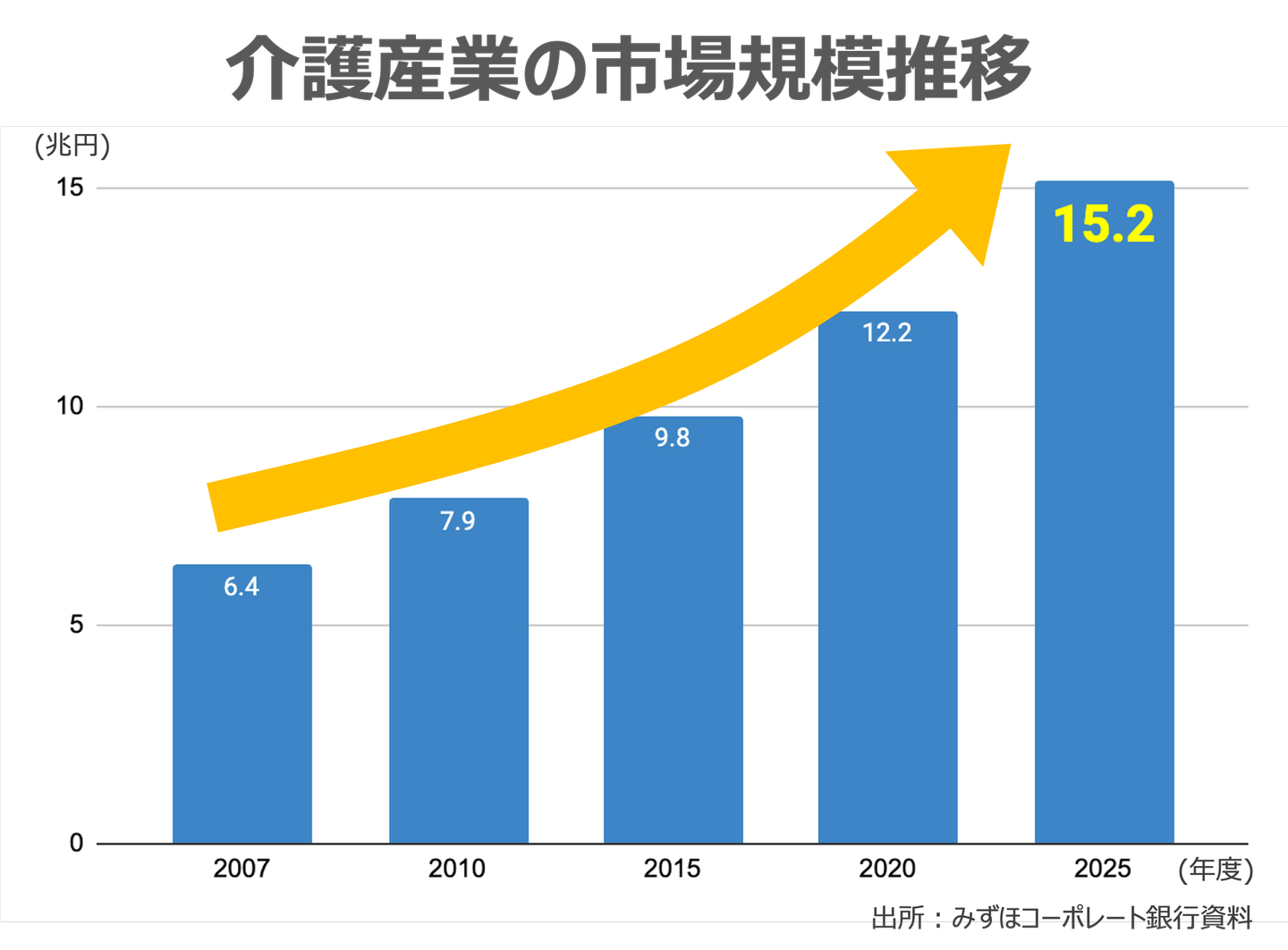 2007年時点で62.9兆円であった高齢者向けの市場規模は、2025年には101.3兆円に及び、その中でも介護産業だけで15.2兆円に及ぶと言われています。