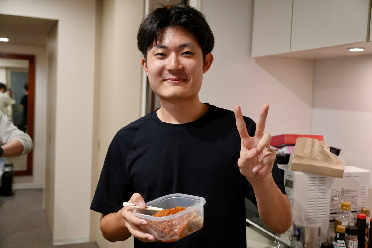 「僕が作ったパスタもアツアツですよ」弊社フロントエンジニアの稲葉くんです