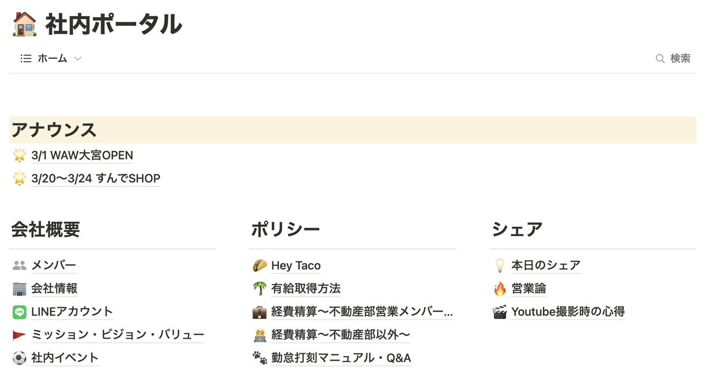 すんで社では、もともとプレスリリースや、住まい情報サービス「すんで」のメンターさんへの情報共有等を目的としてNotionというドキュメントツールを利用しており、Notionの利用についてはもともと慣れていました。そこで、Notionで社内ポータルを作ることになりました。