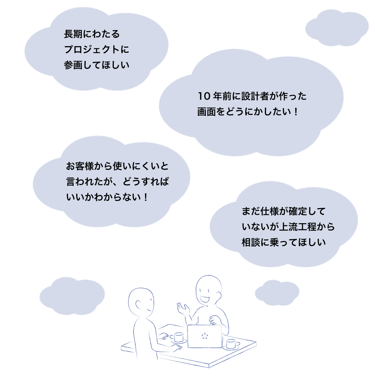 新しいプロダクトの開発時やリニューアルに際し、画面をもっと使いやすくしたい、差別化をはかりたい、お客様から来た課題を解決したい、今の時代に合わせてイメージアップをはかりたいけど、どこに頼めばよいのかわからないなど、UI/UXデザインについてお困りごとがございましたら、どんなことでもお気軽にご相談ください!