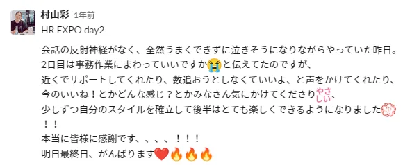 「どうしても厳しいというなら無理しなくていいけど、サポートするのでせっかくならやり遂げないか」と言ってくれ、2日目以降も続けることになりました。この時、同期のourlyセールス乗松も話を聞いて「自分がサポートするので!!!」と言ってくれたらしく、実際に2,3日目ずっと気にかけてサポートしてくれました。大感謝。