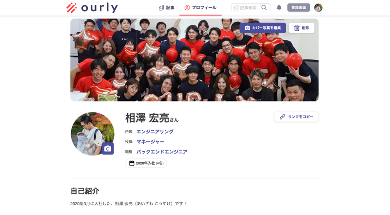 弊社ではourly自体を社内で使っており(ドッグフーディングと言います)、自分のプロフィールページがあるためそれを用いて自己紹介しています。