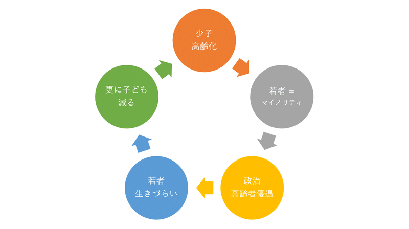 そうすると若者にとっては生きにくい国になるので、子どもを生みにくくなる、人口が減る、ますます若者が少なくなる。人口が減っているので税収が減る。少ない財源のなかで資金をどこに配分するかといえば票を沢山くれる高齢者向けの施策。