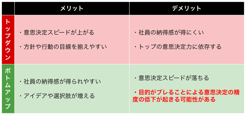 話を戻すとボトムアップ型の意思決定は「目的がブレることによる意思決定の精度の低下が起きる可能性がある」と記載したのはまさにここで、意思決定に複数人が介在すると集団に所属する目的がそれぞれ微妙に異なります。異なる目的に対して意見を述べることになるので、集団として本当に正しい意思決定が行われない可能性が出ます。(日本国の政治ように)