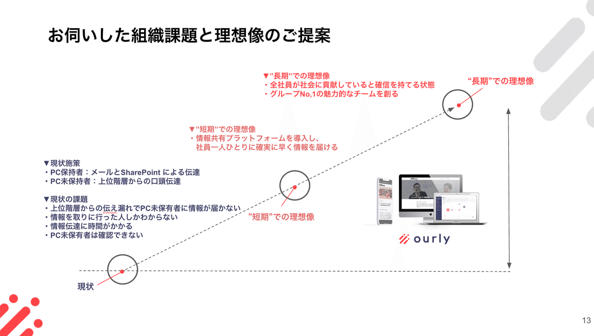 「xx様の理想やプランは素晴らしいですね!ただxx様とはもっと高い成果を目指していきたいと考えています。ご提案を持ってきており、長期でyyまで実現していきたいのですが、いかがでしょうか!」