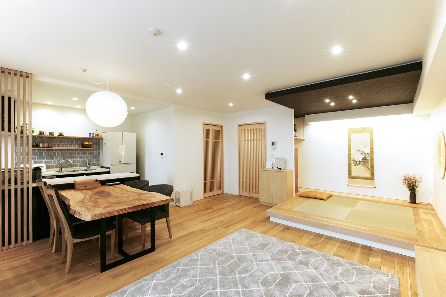 落ち着きを感じられる空間を目指し、建具、照明など、細部までお施主様とこだわり、作られている事例です。