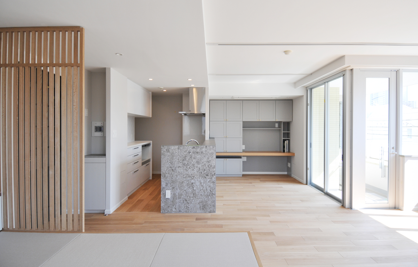 広々としたLDKに、収納付造作畳が丘やルーバー造作間仕切り、キッチン腰壁タイルなど、施工管理として色々な技・知識があってこそ実現できる、機能性・デザイン性に優れた事例です。
