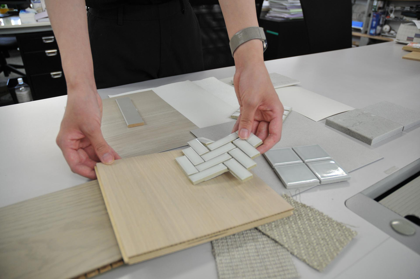 図面や各メーカー設備のプラン図、お見積書などのお渡しする資料をまとめたり、お客様のご要望に合わせた内装材を用意します。