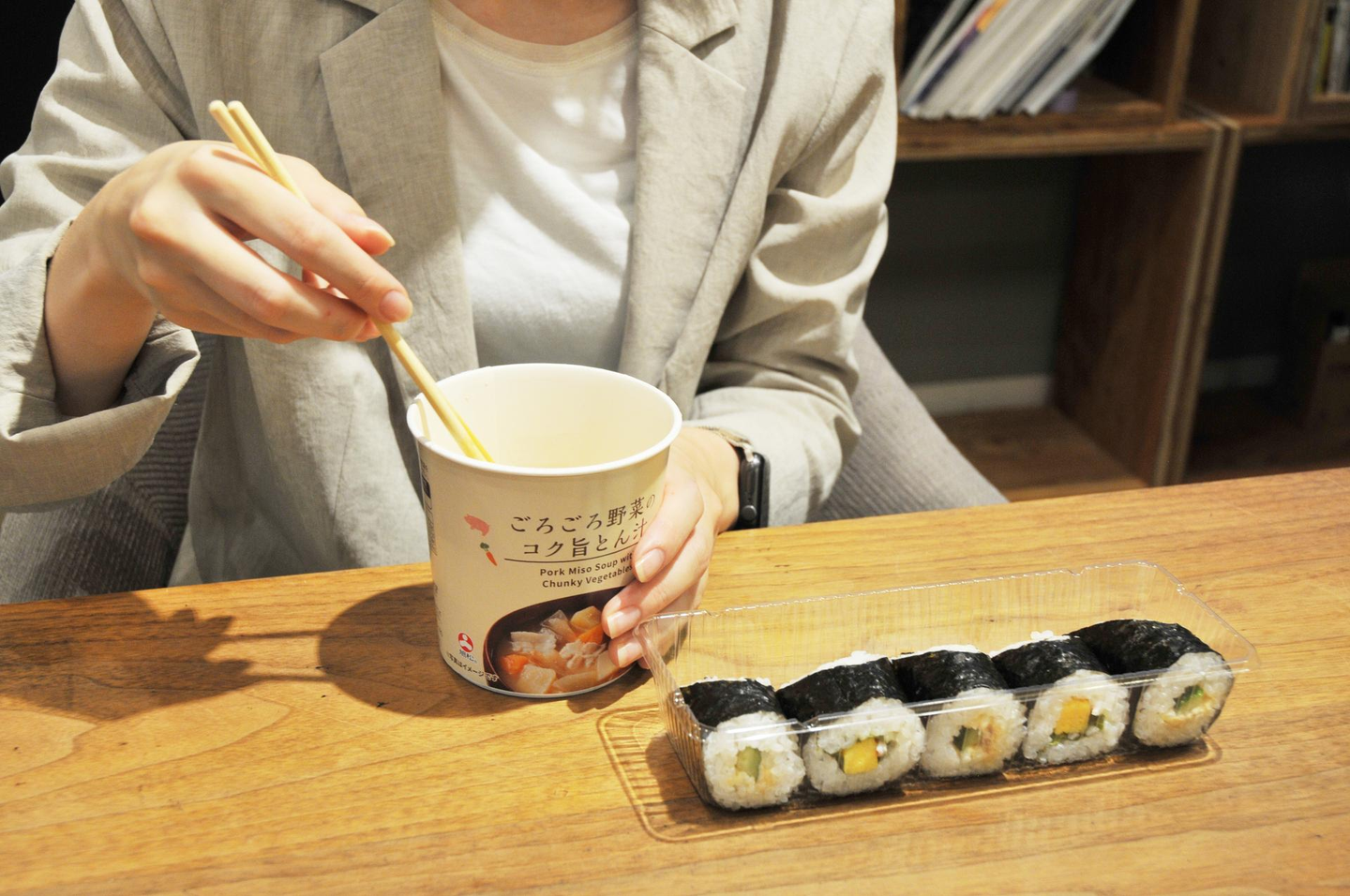 この日のランチは事務所の隣にあるローソンで購入した豚汁とサラダ巻き。