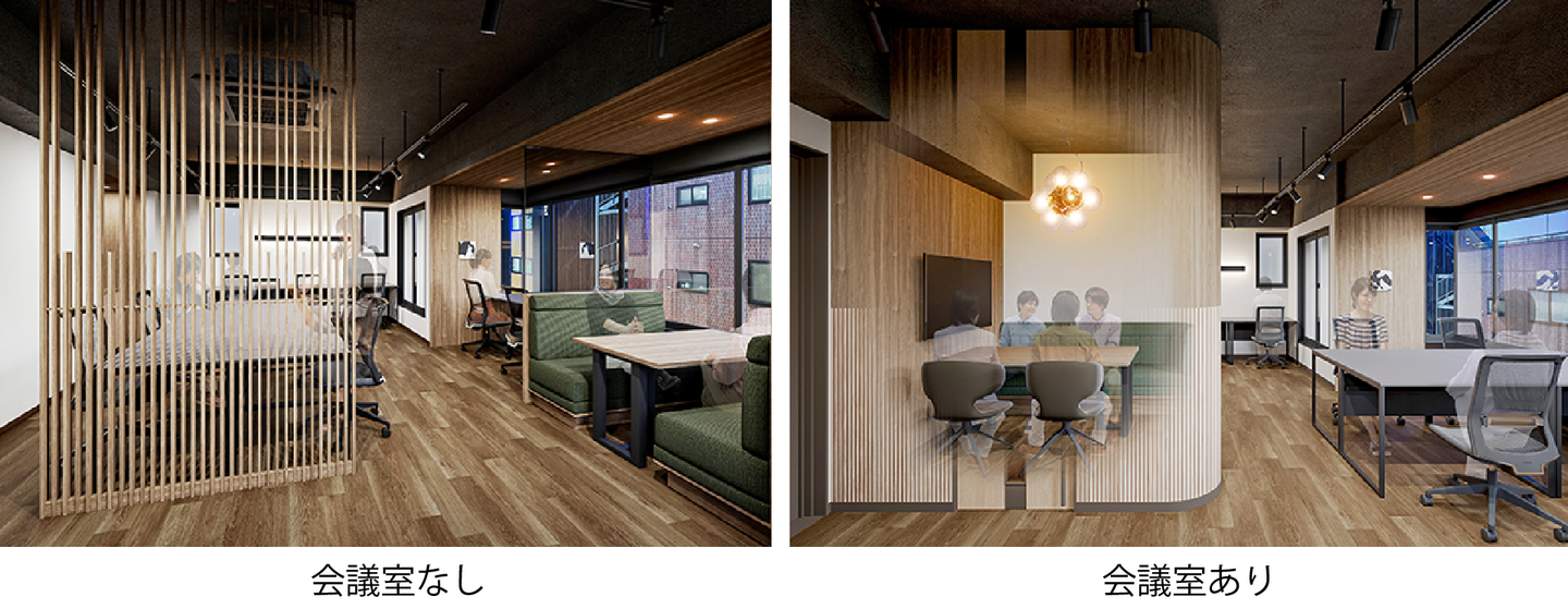 各フロアは用途や働き方に対応できるよう、会議室の有無を選択できるレイアウトパターンを用意。